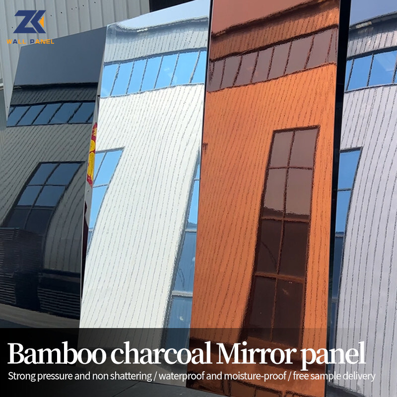 Verspiegeltes PET-Bambus-Holzkohle-Paneel, die Erscheinungstextur ist genau die gleiche wie die Spiegeloberfläche, es ist ein dekoratives Holzfurnierpaneel, das wasserdicht, feuchtigkeitsbeständig, verschleißfest und kratzfest ist und leicht gebogen werden kann. Durch die Kombination des verführerischen Charmes eines Spiegels mit den natürlichen Vorteilen von Bambus-Holzkohle heben verspiegelte Bambus-Holzkohle-Paneele Ihren Wohnraum auf ein neues Niveau und harmonisieren Schönheit und Funktion wie nie zuvor. Entfesseln Sie die visuelle Anziehungskraft und genießen Sie eine attraktive reflektierende Oberfläche, die Ihren Wohnraum erweitert. Unsere verspiegelten Bambus-Holzkohle-Paneele erfassen und spielen leicht mit Licht und erzeugen eine Illusion von Offenheit und Erhabenheit. Verwandeln Sie Ihr Zimmer in einen Schrein der Eleganz und Raffinesse. Verspiegelte Bambus-Holzkohle-Wandpaneele reinigen nicht nur die Luft, indem sie unerwünschte Gerüche und Schadstoffe absorbieren, sondern schaffen auch eine friedliche Atmosphäre, die Entspannung und Wohlbefinden fördert. Umarmen Sie die Ruhe, die nur die natürlichen Elemente bieten können.