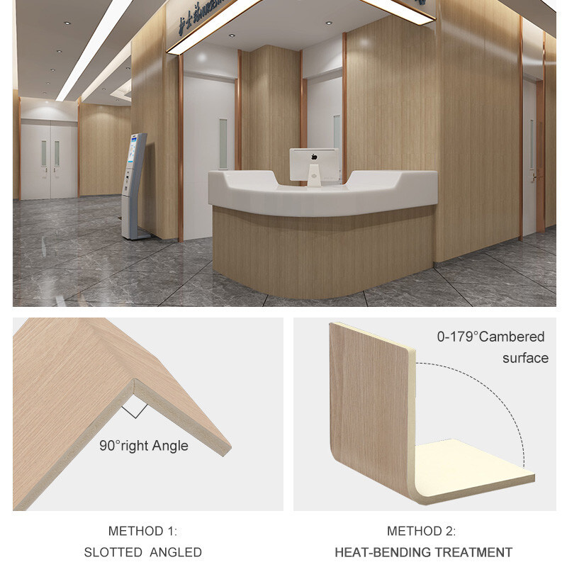 Holzmaserungs-Bambus-Holzkohle-Holzfurnier nutzt die natürliche Schönheit der Holzmaserung und die zusätzlichen Vorteile von wasserdichtem, feuerfestem, feuchtigkeitsbeständigem und umweltfreundlichem Bambus-Holzkohle, um die Atmosphäre des Hotelraums zu verbessern. Das Holzfurnier zeichnet sich durch ein raffiniertes Holzmaserungsdesign aus, das den Hotelinnenräumen einen Hauch von Wärme und Raffinesse verleiht. Die detaillierte Holzmaserung erzeugt einen bezaubernden visuellen Effekt und verstärkt die Schönheit des Raumes. Das Holzfurnier ist auf Praktikabilität ausgelegt und widersteht Wasser und Feuchtigkeit. Es ist effektiv wasserdicht, was Langlebigkeit gewährleistet und feuchtigkeitsbedingte Probleme verhindert. Dies macht es ideal für Gastgewerbebereiche, in denen Haltbarkeit und einfache Wartung wichtig sind. Holzoberflächen sind feuer- und hitzebeständig. Seine inhärente Feuerbeständigkeit stellt sicher, dass Gastgewerbebereiche geschützt sind, um die Sicherheit zu gewährleisten. Das Furnier besteht aus umweltfreundlicher Bambus-Holzkohle, die sowohl elegant als auch nachhaltig ist. Die Verwendung umweltfreundlicher Materialien entspricht der Moderne und verleiht dem Innenraum des Hotels einen grünen Touch.