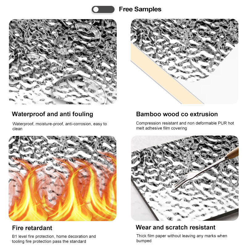 Einfache Installation, Umweltschutz, Flexibel, Biegsam, Hohe Dichte, faltbar. Feuerfest + wasserdicht + feuchtigkeitsbeständig + kratzfest + schallabsorbierend, schimmelresistent. Leicht. Klare Texturen, Vielzahl von Farben usw.